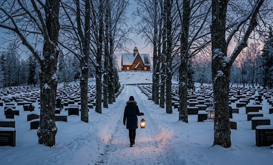 Bia mộ cao thấp lớn nhỏ khác nhau, sắp thành lối bàn cờ, chính giữa có một con đường nhỏ trồng hai hàng sồi cổ thụ dẫn lên đỉnh đồi. Chữ khắc trên nhiều tấm bia đã bị thời gian và băng giá bào mòn, chỉ còn lại vài ký tự cách quãng, những cái tên mà có lẽ không còn ai nhớ. Thỉnh thoảng lại có một khu mộ gia đình với hơn chục tấm bia được làm cùng kiểu với nhau. Vài ngôi mộ vẫn còn nến đang cháy dở, dù tuyết cũng đã phủ kín xung quanh khiến nó mang dáng vẻ bị lãng quên như những ngôi mộ khác.